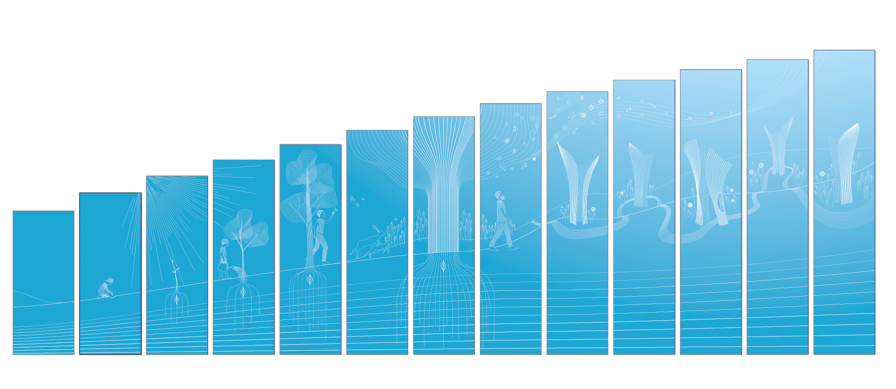 The huge glass frontal facade is, in total, 47meters wide. My illustrations has been realized in pre-spaced graphics. The lines are consistent with the shape of the big wooded tree in the middle, and they seem to radiate directly from it, conveying a mix of icons and illustrations from the traditional and modern Azerbaijan: from the Ateshgah temple to the Flame Towers in Baku.